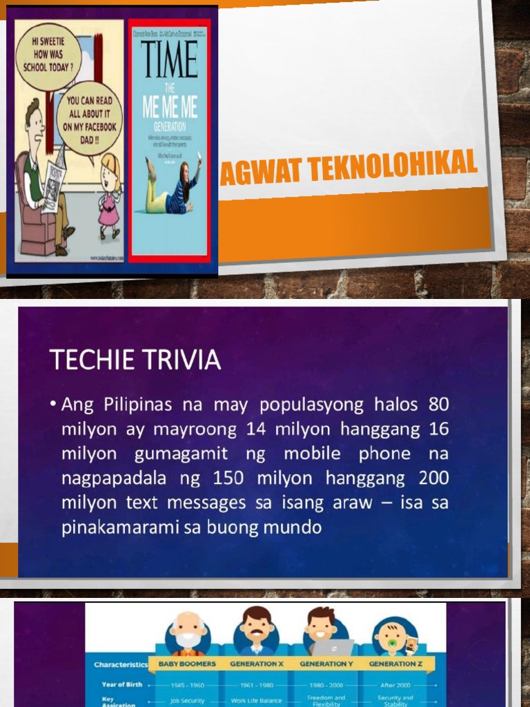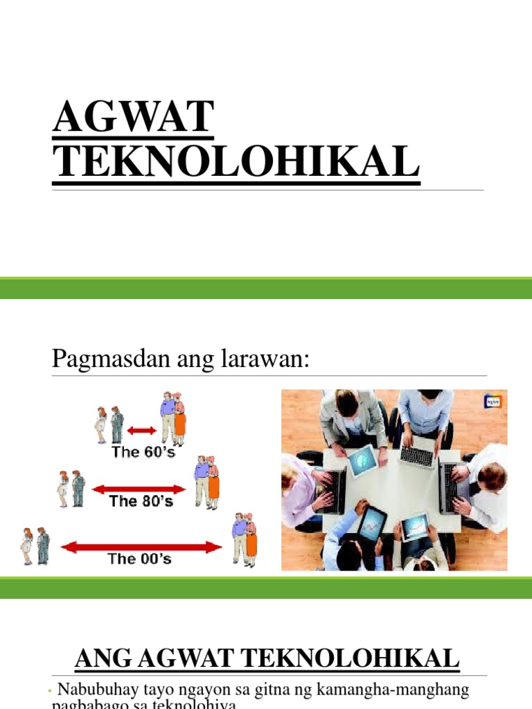 Agwat teknolohikal ppt. View Agwat-teknolohiya_Esp_report_ppt_bmapptx from RSCH 8101H at UET Taxila. ANG AGWAT TEKNOLOHIKAL Nabubuhay tayo ngayon sa gitna ng kamangha-manghang pagbabago sa teknolohiya. Ito ay ang pagkakaiba sa pagitan ng mga nakababata at nakatatandang henerasyon lalo na sa pagitan ng mga anak at mga magulang.