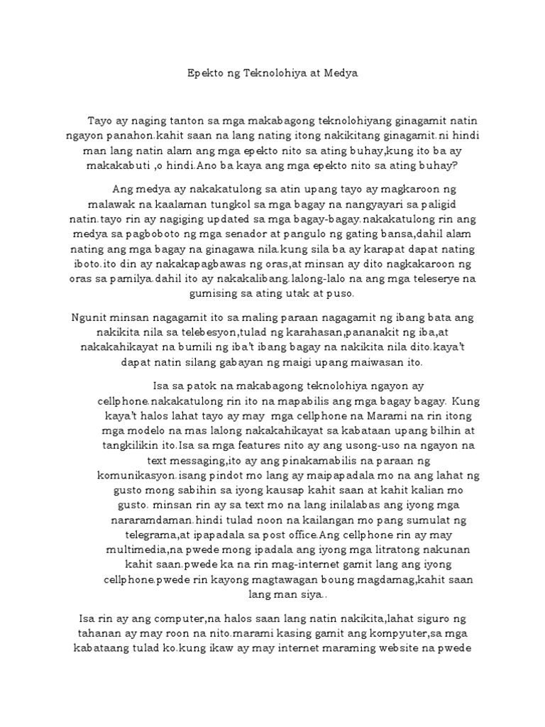 Kasi nakakalimutan na ng mga kabataan ngayon ang pag galang sa mga nakakatanda gaya ng mga salitang ito po at opodahil mas inuuna nila ang pag hawak sa kanilang mga gadget. Emilia Laguardia Guro sa Filipino 2 Marso2012 DAHON NG PAGPAPATIBAY Bilang pagtupad sa isa sa mga pangangailangan ng asignaturang Filipino 2 Pagbasa at Pagsulat Tungo sa Pananaliksik ang pamanahong-papel na ito na pinamagatang Epekto ng mga Makabagong Teknolohiya sa Buhay ng Tao ay inihanda at iniharap ng pangkat ng mga mananaliksik mula sa isang grupo na binubuo nina. 30062017 Ang Teknolohiya ay isa sa pinakaimportanteng mapag-kukuhaan ng impormasyon ng mga magaaral sa panahon ngayon sa pamamagitan ng cellphone laptop computer at projectors.