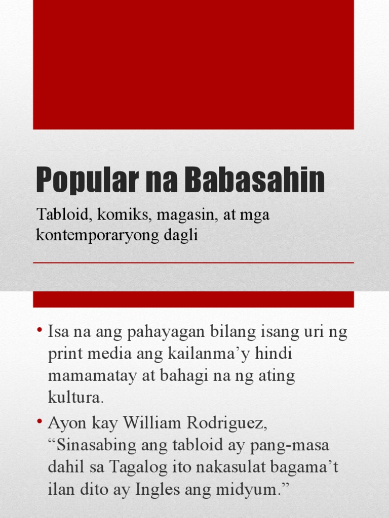 PAGBABALIK TANAW SA MGA KAUGNAY NA BABASAHIN INTRODUKSYON Ang sakit ng hepatitis ay madalas na sinasabing sakit ng mga mayayaman dahil sa mga suot nilang gintong alahas. View Filipino 8 Popular na Babasahinpptx from ENG 1D at Blessed Trinity Secondary School. Bakit nagkaroon ng transpormasyon ang tradisyonal na panitikang Pilipino tungo sa panitikang popular.