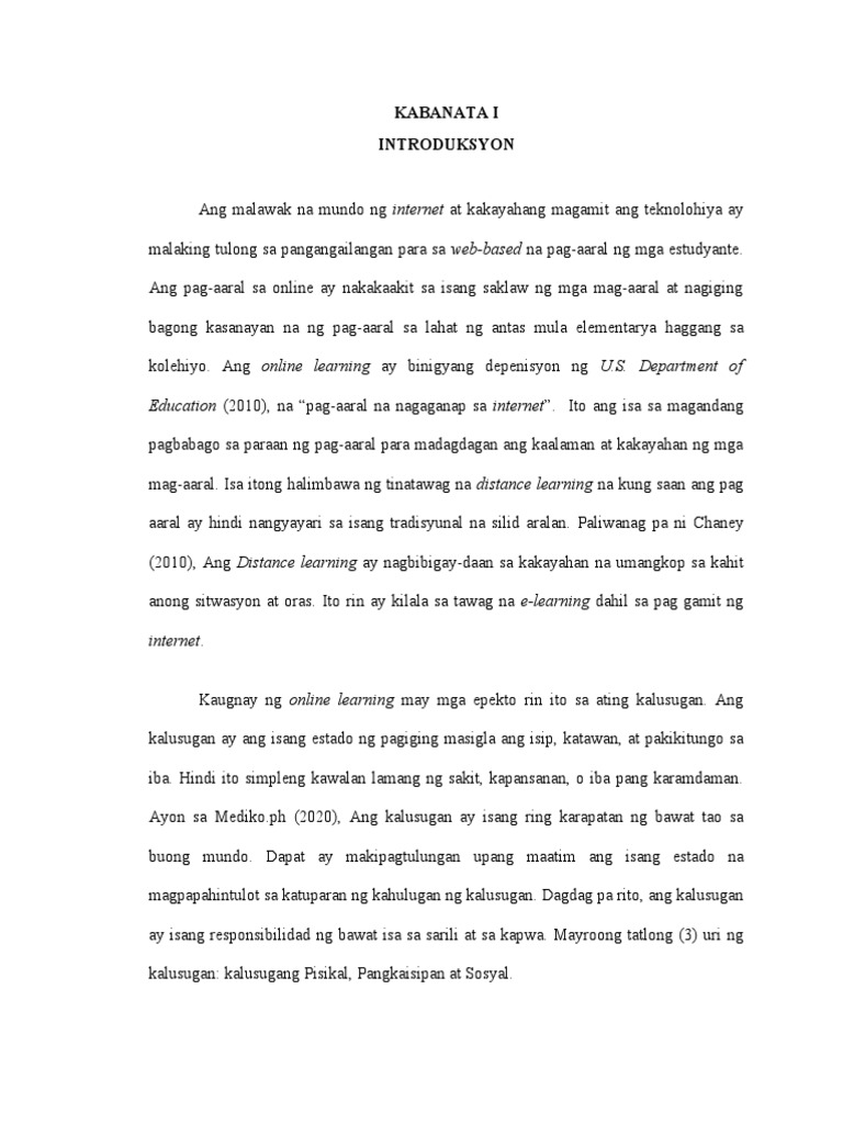 EPEKTO NG TEKNOLOHIYA SA PAG-AARAL NG MGA MAG-AARAL Isang reserts report na iniharap sa mga dalubguro bilang pangangailangan para sa asignaturang Fil109 ni DONALD COGO KOLEHIYO NG SKSU KALAMANSIG SULTAN KUDARAT ENERO 10 2014 KABANATA 1 PANIMULA Tungkulin ng mga kabataan ang mag-aral kapag ang mga kabataan ay napapagud na sa. Napoleon Sipalay Jr OP. Sa panahon ng pandemya isa ito sa pinakamahirap na haharapin ng ating bayan.