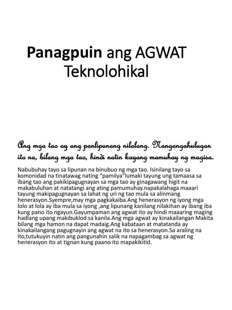 Preview this quiz on Quizizz. AGWAT TEKNOLOHIKAL Tunay ngang napakabilis ng pagbabago sa teknolohiya ngayon. MGA URI NG PAMBUBULAS BULLYING 4.