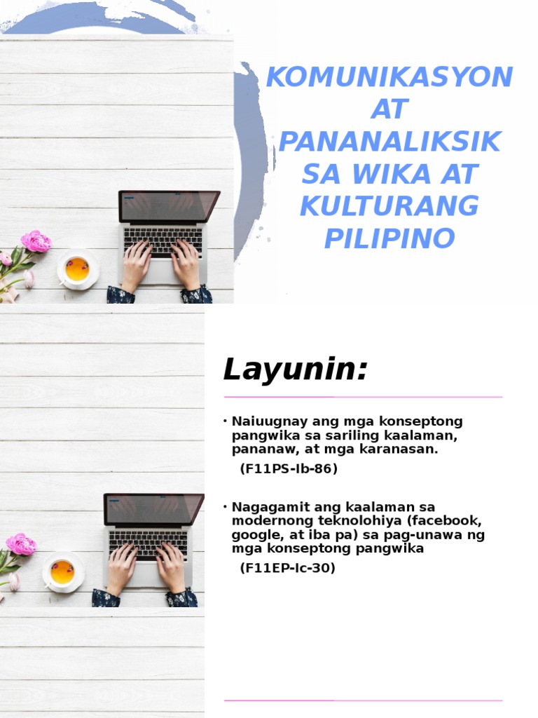 Konseptong pangwika sa mga napanood na sitwasyong pang komunikasyon sa telebisyon Naiuugnay ang mga konseptong pangwika sa sariling kaalaman pananaw at mga karanasan Nagagamit ang kaalaman sa modernong teknolohiya facebook google at iba pa sa pag-unawa sa mga konseptong pangwika 1-10 F11PN Ia 86 F11PT Ia 85. Filipino 11 Q1 Instructional Material Pag-uugnay ng mga konseptong pangwika sa mga napakinggang sitwasyong pangkomunikasyon. Ito ay ang konsepto ng wika ng Filipinas wikang katutubo wikang opisyal wikang panturo wikang pantulong.