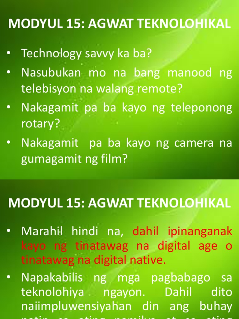 Bilang isang nagdadalaga at nagbibinata paano mo ipinakikita ang mgaangkop na kilos o tamang. Mga Isyu at Suliraning Dulot ng Teknolohiya. Agwat Teknolohikal Nabubuhay tayo ngayon sa gitna ng mga kamangha- manghang pagbabago sa teknolohiya.